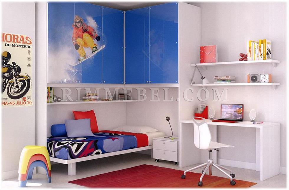 Композиция для детской комнаты. В композицию входят: модульная стенка, кровать, письменный стол с креслом, полки. Дверцы шкафа можно декорировать постерами, надписями или тканевыми карманами. Возможны другие варианты отделки