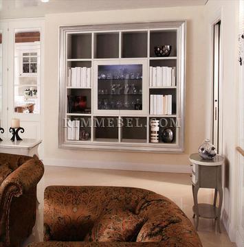 Подвесная стенка с открытыми книжными полками и витриной. Витрина с подсветкой, полки выполнены из стекла. Возможны другие варианты отделки.