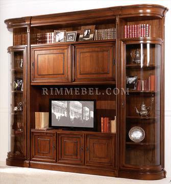 Стенка с нишей под TV, 2-мя витринами, открытыми и закрытыми полками. Полки в витринах выполнены из стекла. Возможны другие варианты отделки.