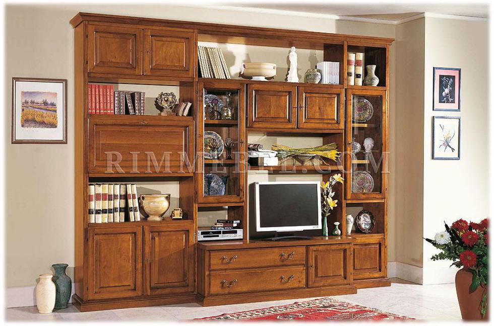 Модульная стенка. В композицию входят: 2 витрины, тумба под TV , открытые полки, распашные дверцы и 2 ящика. Возможны различные варианты отделки(красное дерево, декапе, крашенное в различные цвета, медный лист или напыление, и т.д.)