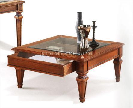 Квадратный журнальный стол с ящиком. Столешница выполнена из стекла, также можно выполнить из дерева. Декорирован резными элементами ручной работы. Возможны различные варианты отделки.