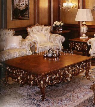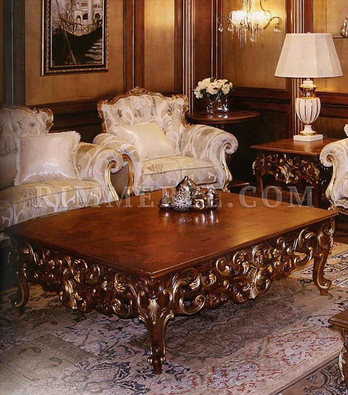 Квадратный журнальный стол. Столешница выполнена из дерева, также можно выполнить из мрамора. Декорирован резными элементами ручной работы. Возможны различные варианты отделки и мрамора.