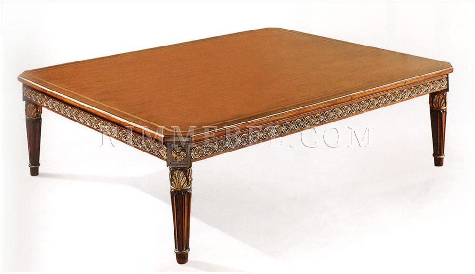Прямоугольный журнальный стол. Столешница выполнена из дерева, также можно выполнить из мрамора или стекла. Декорирован резными элементами ручной работы. Возможны различные варианты отделки и мрамора