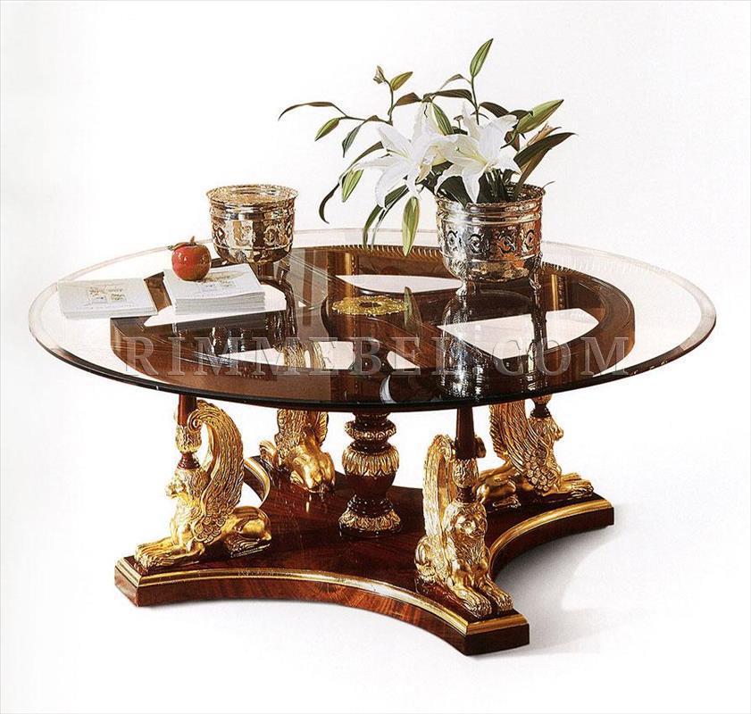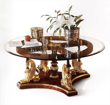 Круглый журнальный стол. Столешница выполнена из стекла. Декорирован резными элементами ручной работы. Возможны различные варианты отделки.