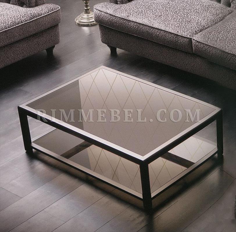 Прямоугольный журнальный стол, столешница выполнена из стекла. Возможны различные варианты отделки.