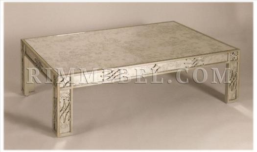 Прямоугольный журнальный стол. Столешница выполнена из состаренного стекла. Декорирован резными элементами ручной работы.