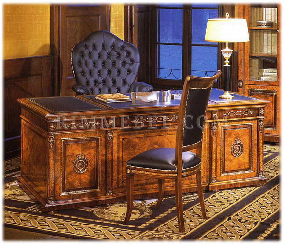 Письменный стол с 9-ю выдвижными ящиками. Декорирован резными элементами. Столешница обита кожей. Возможны другие варианты отделки