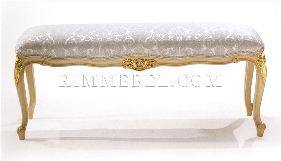 Банкетка. Декорирована резными элементами ручной работы. Наполнение - полиуретан. Возможны различные варианты обивки и отделки.