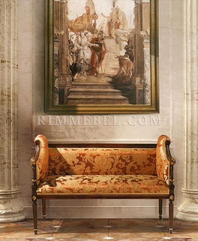 Банкетка со спинкой. Декорирована резными элементами ручной работы. Наполнение - полиуретан. Возможны различные варианты обивки и отделки.