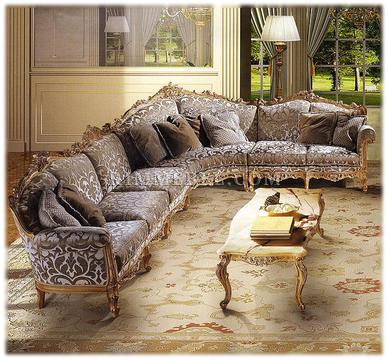 Угловой секционный диван. Наполнение - полиуретан. Декорирован резьбой. Ручная работа. Возможны различные варианты отделки (красное дерево, махагон, охра, декапе и т.д.) и обивки.