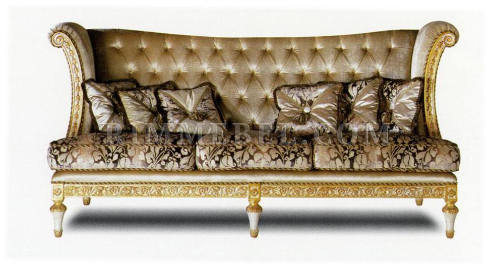 3-х местный диван с высокой спинкой, декорированный резьбой. Наполнение - полиуретан. Возможны другие варианты отделки и обивки, в том числе выполнение в ткани клиента. Декоративные подушки включены в стоимость