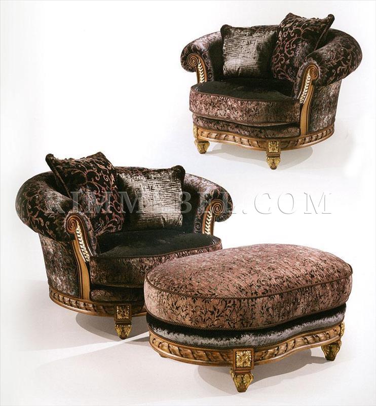 Кресло, спинка расположена на одном уровне с подлокотниками. Декорировано резными элементами ручной работы. Наполнение - полиуретан. Возможны различные варианты обивки и отделки.