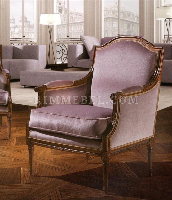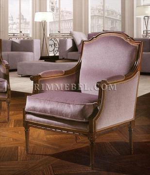 Кресло, подлокотники с мягкими накладками. Декорировано резными элементами ручной работы. Наполнение - полиуретан. Возможны различные варианты обивки и отделки.