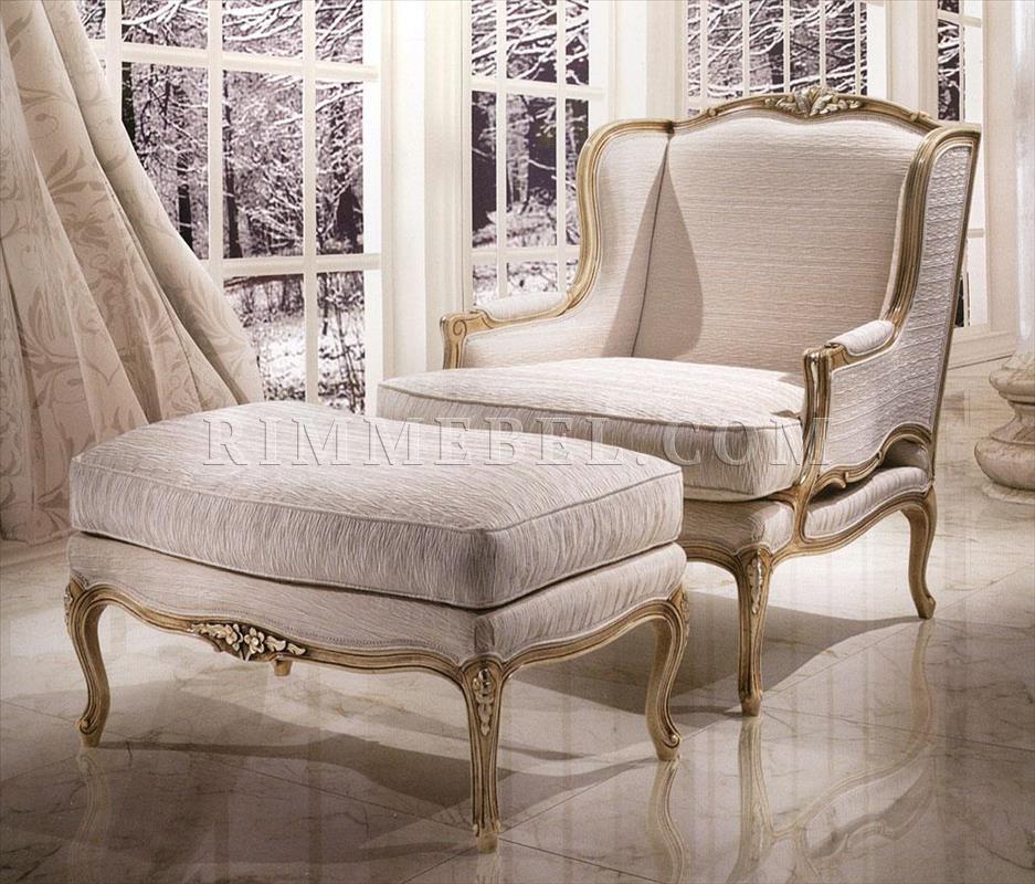 Кресло, подлокотники с мягкими накладками. Декорировано резными элементами ручной работы. Наполнение - полиуретан. Возможны различные варианты обивки и отделки.