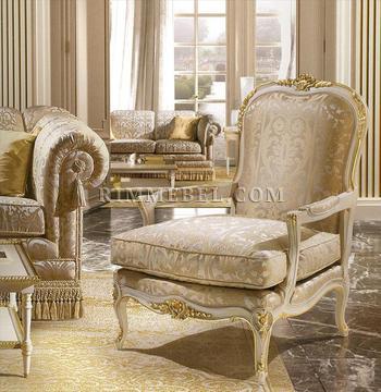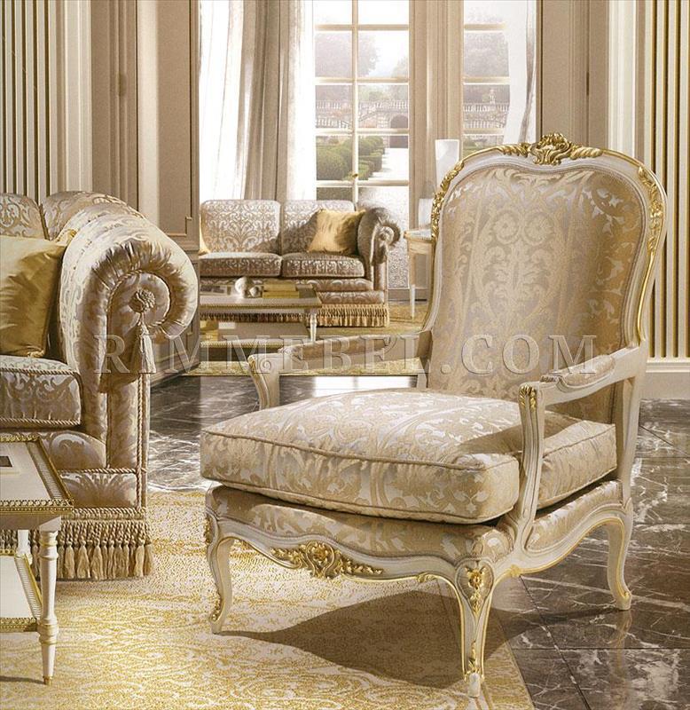 Кресло, подлокотники с мягкими накладками. Декорировано резными элементами ручной работы. Наполнение - полиуретан. Возможны различные варианты обивки и отделки.