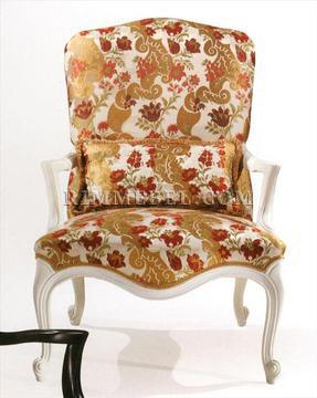 Кресло, подлокотники с мягкими накладками. Декорировано резными элементами ручной работы. Наполнение - полиуретан. Возможны различные варианты обивки и отделки.