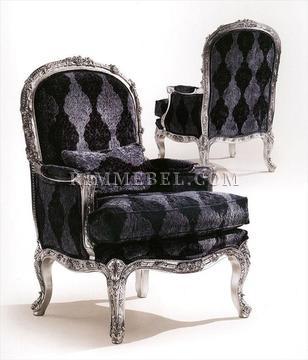 Кресло, подлокотники с мягкими накладками. Декорировано резными элементами ручной работы. Наполнение - полиуретан. Возможны различные варианты обивки и отделки.