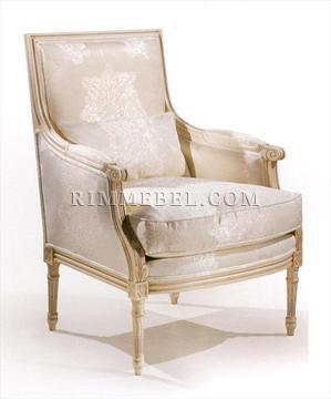 Кресло, подлокотники с мягкими накладками. Декорировано резными элементами ручной работы. Наполнение - полиуретан. Возможны различные варианты обивки и отделки.