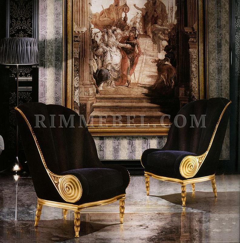Кресло без подлокотников. Декорировано резными элементами ручной работы. Наполнение - полиуретан. Возможны различные варианты обивки и отделки.