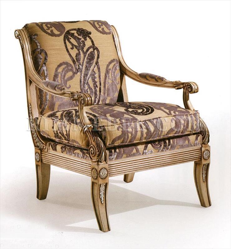 Кресло, подлокотники с мягкими накладками. Декорировано резными элементами ручной работы. Наполнение - полиуретан. Возможны различные варианты обивки и отделки.