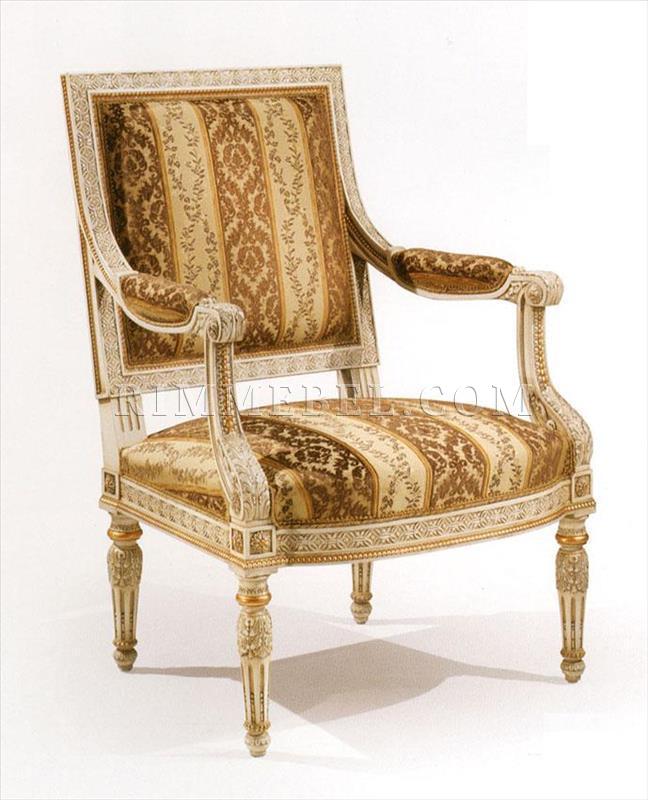 Кресло, подлокотники с мягкими накладками. Декорировано резными элементами ручной работы. Наполнение - полиуретан. Возможны различные варианты обивки и отделки.