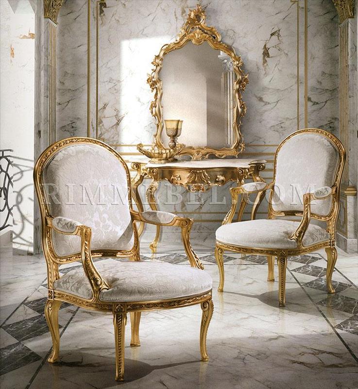 Кресло, подлокотники с мягкими накладками. Декорировано резными элементами ручной работы. Наполнение - полиуретан. Возможны различные варианты обивки и отделки.