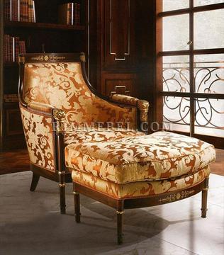 Кресло, подлокотники с мягкими накладками. Декорировано резными элементами ручной работы. Наполнение - полиуретан. Возможны различные варианты обивки и отделки.