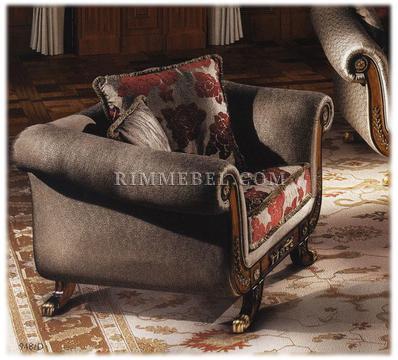 Кресло, спинка расположена на одном уровне с подлокотниками. Декорированo резьбой. Ручная работа. Наполнение - полиуретан. Возможны различные варианты отделки (красное дерево, махагон, охра, декапе и т.д.) и обивки.