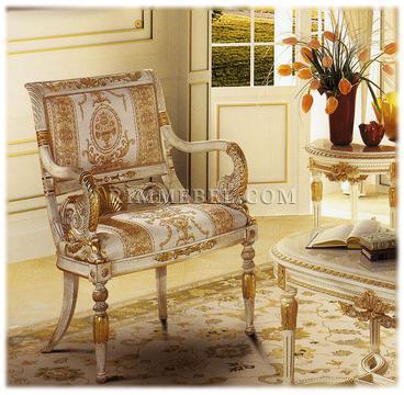 Кресло, жесткие подлокотники. Наполнение - полиуретан. Декорировано резьбой. Ручная работа. Возможны различные варианты отделки (красное дерево, махагон, охра, декапе и т.д.) и обивки.