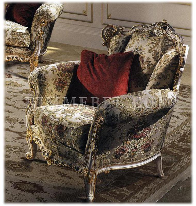 Кресло. Наполнение - полиуретан. Декорировано резьбой. Ручная работа. Возможны различные варианты отделки (красное дерево, махагон, охра, декапе и т.д.) и обивки.