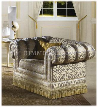 Кресло, спинка расположена на одном уровне с подлокотниками. Наполнение - полиуретан. Декорировано бахромой. Ручная работа. Возможны различные варианты обивки.