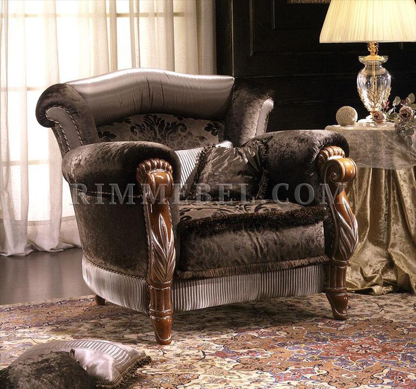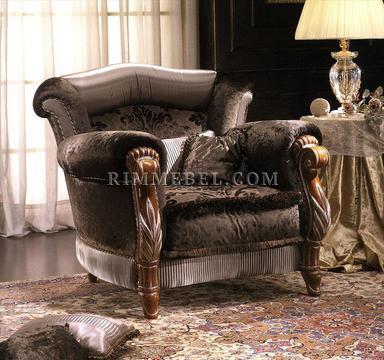 Кресло, декорированное ручной резьбой. Структура - бук, наполнение - полиуретан. Возможны другие варианты обивки и отделки. Возможна декорация стразами Сваровски. Декоративные подушки включены в стоимость