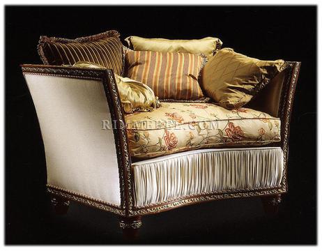 Кресло, спинка расположена на одном уровне с подлокотниками. Наполнение - полиуретан. Декорировано резными элементами. Возможны другие варианты отделки и обивки.