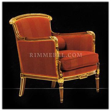 Кресло, жесткие подлокотники. Наполнение - полиуретан. Декорировано резными элементами. Возможны другие варианты отделки и обивки.
