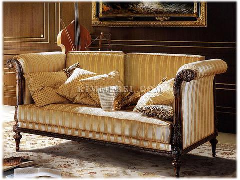 3-х местная софа, спинка расположена на одном уровне с подлокотниками. Наполнение - полиуретан. Декорирована резьбой. Ручная работа. Возможны различные варианты отделки (красное дерево, махагон, охра, декапе и т.д.) и обивки.