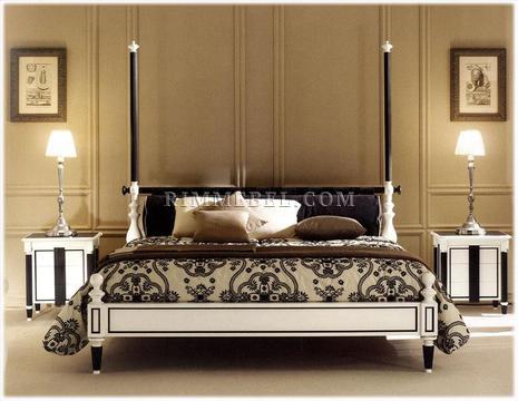 Двуспальная кровать с колоннами, мягкое изголовье, без изножья. Структура - орех, отделка черная и белая лакировка. Возможны другие варианты отделки.