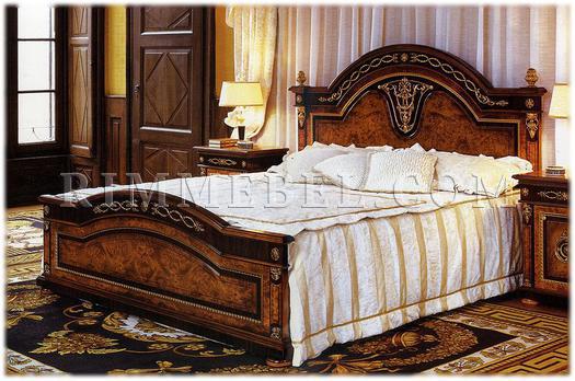Двуспальная кровать с изголовьем и изножьем, декорированная резными элементами. Возможны другие варианты отделки, возможен вариант кровати без изножья
