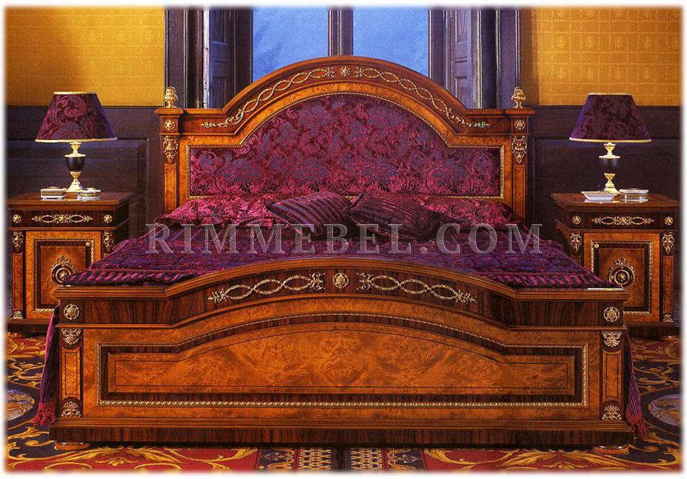 Двуспальная кровать с мягким изголовьем и изножьем, декорированная резными элементами. Возможны другие варианты отделки и обивки, в том числе выполнение в ткани клиента