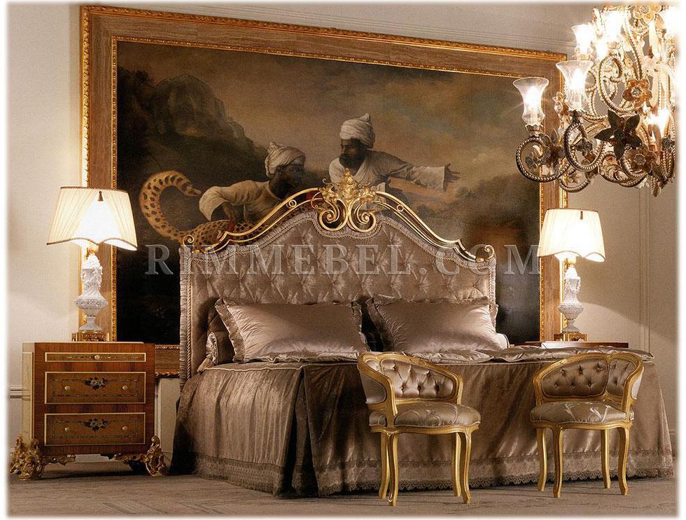Двуспальная кровать с высоким мягким изголовьем, без изножья. Наполнение - полиуретан. Декорирована резными элементами ручной работы. Возможны другие варианты обивки.