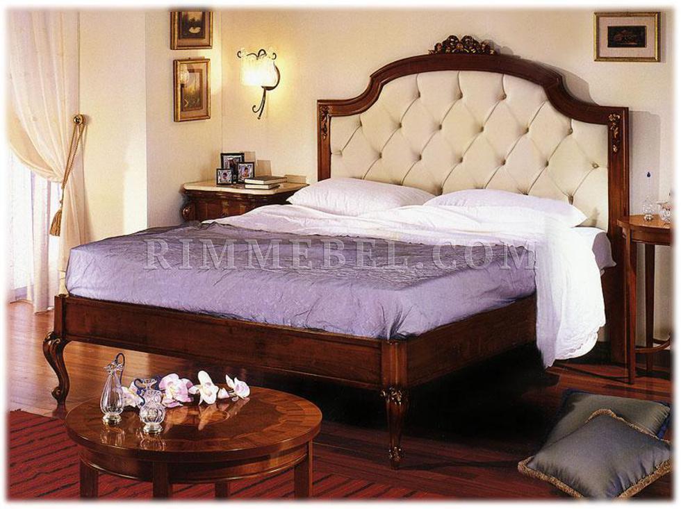 Двуспальная кровать с высоким мягким изголовьем, без изножья. Декорирована резьбой. Наполнение - полиуретан. Возможны другие варианты обивки и отделки.