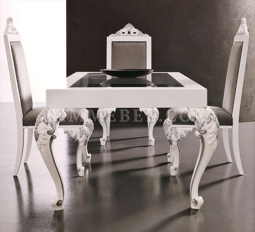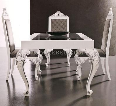 Прямоугольный обеденный стол, столешница выполнена из стекла. Столешницу также можно выполнить в отделке из кожи. Ножки декорированы резьбой. Возможны другие варианты отделки.