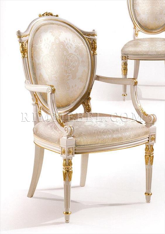 Стул с подлокотниками, мягкие сидение и спинка, жесткие подлокотники. Декорирован резными элементами ручной работы. Наполнение - полиуретан. Возможны различные варианты обивки и отделки.