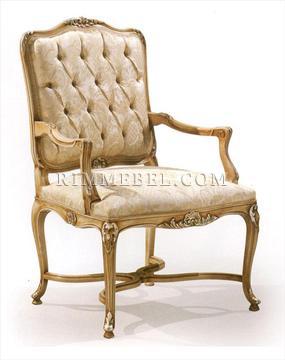 Стул с подлокотниками, мягкие сидение и спинка, жесткие подлокотники. Декорирован резными элементами ручной работы. Наполнение - полиуретан. Возможны различные варианты обивки и отделки.