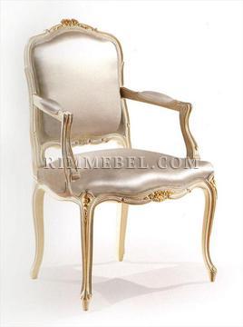 Стул с подлокотниками, мягкие сидение и спинка, жесткие подлокотники. Декорирован резными элементами ручной работы. Наполнение - полиуретан. Возможны различные варианты обивки и отделки.