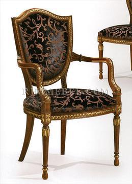 Стул с подлокотниками, мягкие сидение и спинка, жесткие подлокотники. Декорирован резными элементами ручной работы. Наполнение - полиуретан. Возможны различные варианты обивки и отделки.