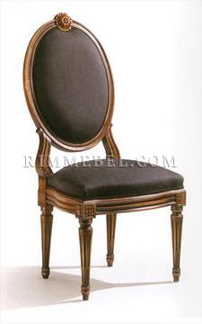 Стул, мягкие сидение и спинка. Декорирован резными элементами ручной работы. Наполнение - полиуретан. Возможны различные варианты обивки и отделки.