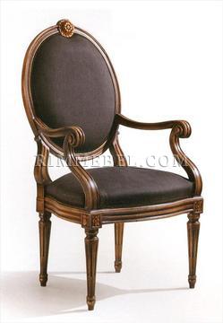 Стул с подлокотниками, мягкие сидение и спинка, жесткие подлокотники. Декорирован резными элементами ручной работы. Наполнение - полиуретан. Возможны различные варианты обивки и отделки.
