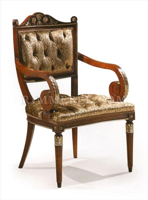 Стул с подлокотниками, мягкие сидение и спинка, жесткие подлокотники. Декорирован резными элементами ручной работы. Наполнение - полиуретан. Возможны различные варианты обивки и отделки.