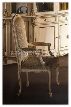 Стул c подлокотниками, возможен вариант без подлокотников. Мягкие сиденье и спинка, подлокотники с мягкими накладками. Наполнение - полиуретан. Декорирован резьбой. Ручная работа. Возможны различные варианты отделки (красное дерево, махагон, охра, декапе и т.д.) и обивки.