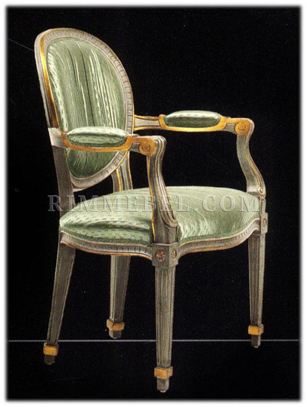 Стул с подлокотниками, мягкие сидение и спинка, подлокотники с мягкими накладками. Наполнение - полиуретан. Декорирован резными элементами. Возможны другие варианты отделки и обивки.